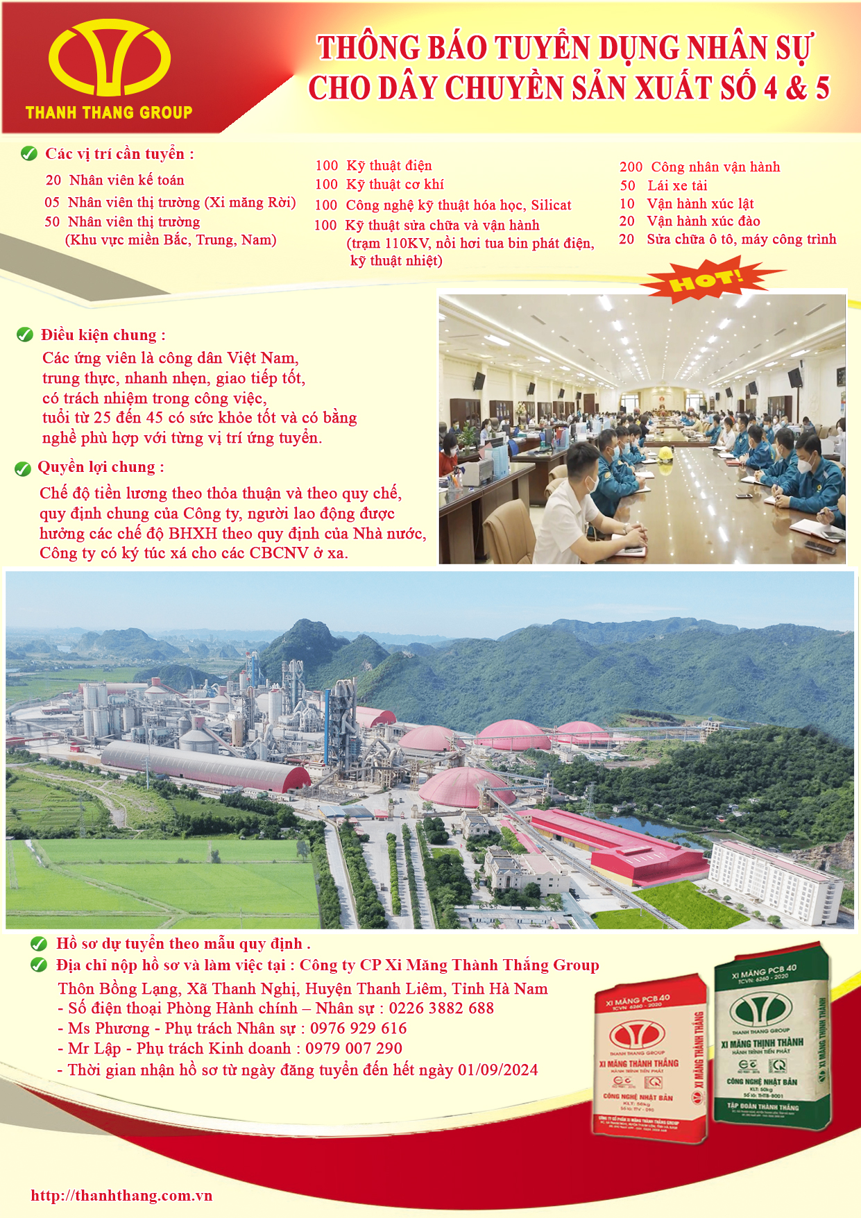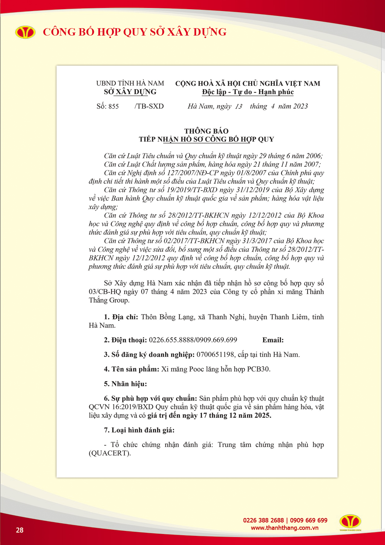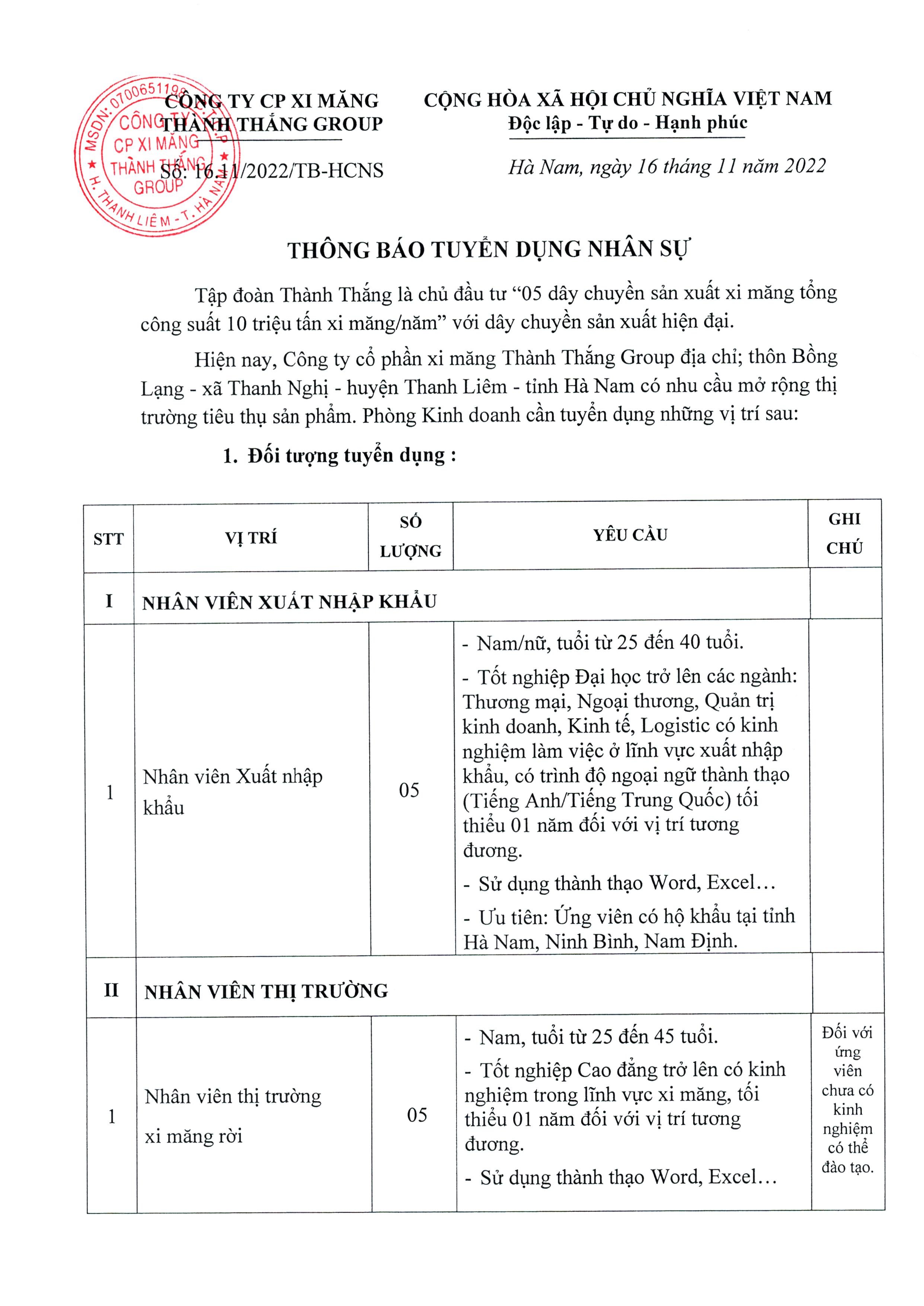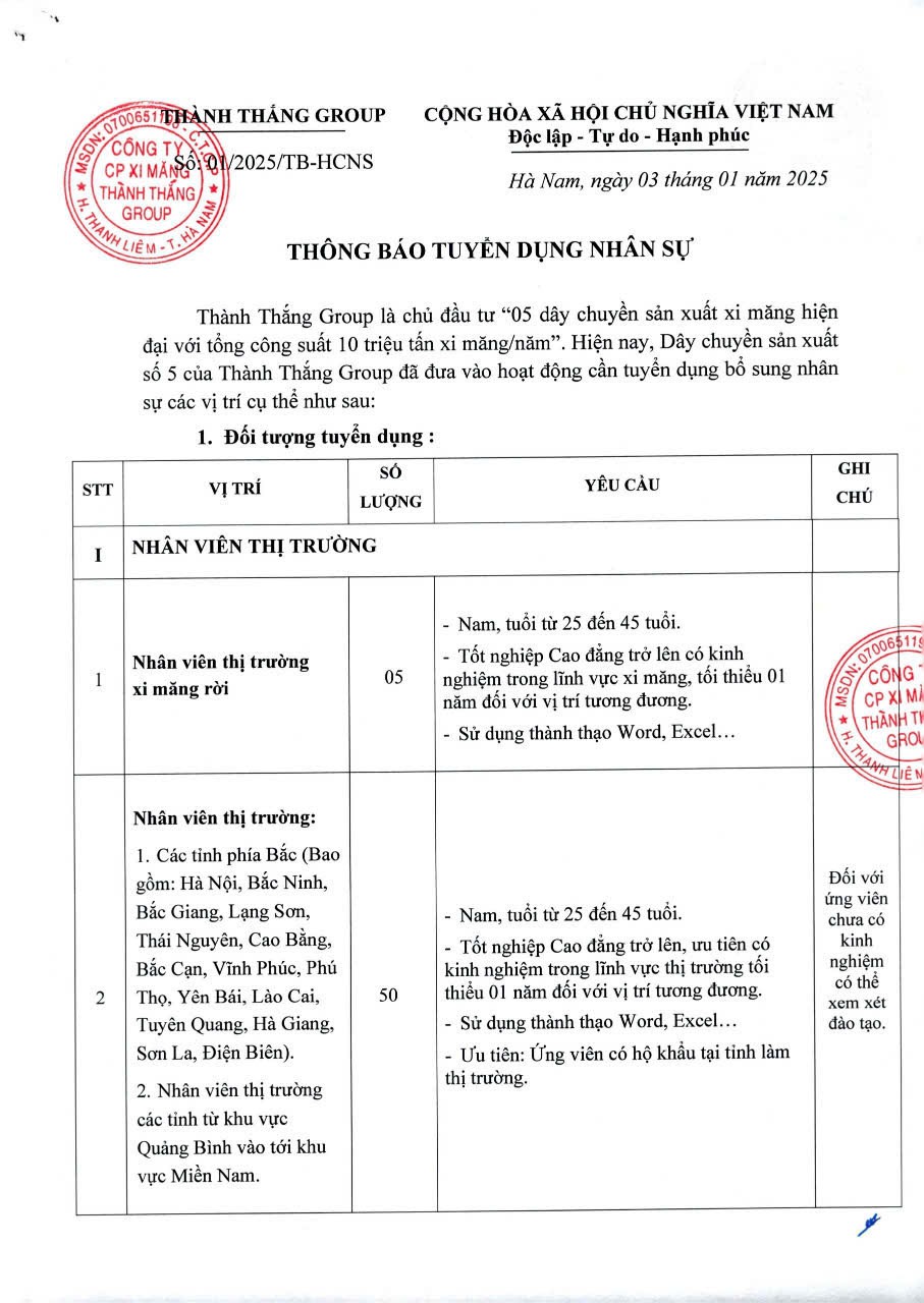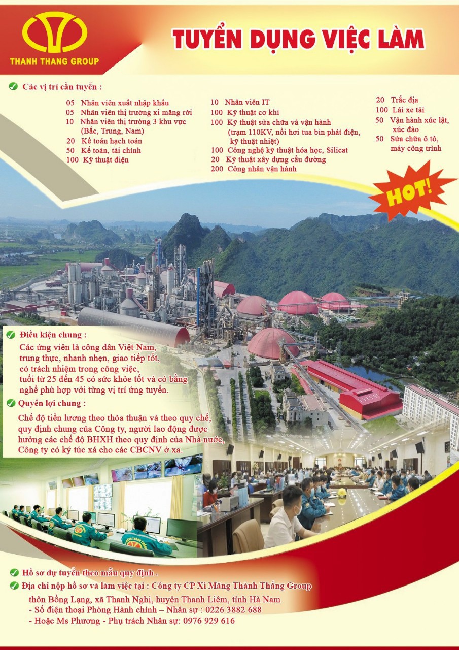 Tập đoàn Thành Thắng là chủ đầu tư “5 dây chuyền sản xuất xi măng tổng công suất 10 triệu tấn xi măng/năm” với lượng CBCNV hơn 2000 người, dây chuyền sản xuất hiện đại được điều khiển tự động hóa 100%. Tập đoàn được tọa lạc trên diện tích hơn 130ha sát gần tuyến đường 1A cách thành phố Phú Lý tỉnh Hà Nam 12km về phía nam, cạnh sông Đáy chảy thông ra biển.