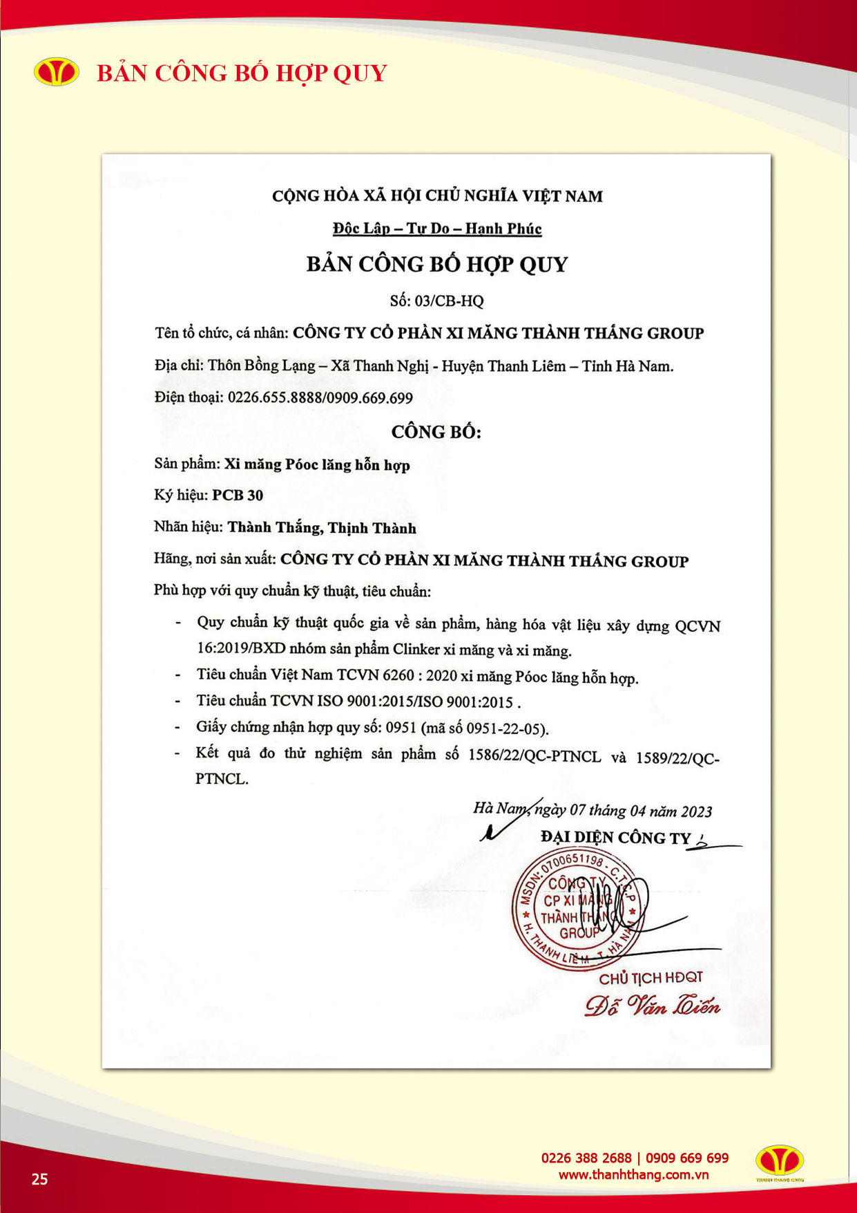 - Giấy chứng nhận đăng ký doanh nghiệp/Giấy chứng nhận đăng ký đầu tư: 2700269063 do Sở Kế hoạch và Đầu tư tỉnh Ninh Bình cấp ngày 05/8/2005 thay đổi lần thứ 15 ngày 25/12/2024